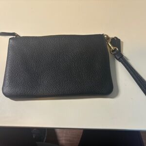 Crafted in polished pebble leather detailed with smooth rivets, this black wristlet from Coach is perfectly sized for cards, cash and a phone. Wear it on your wrist or clip it inside a larger Coach bag. It features two credit card slots, zip-top closure, fabric lining, detachable wrist strap and fits an iPhone or Android.