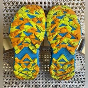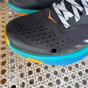 Stylish Hoka athletic shoes. Black upper with blue accents. Perfect for running.