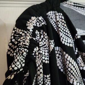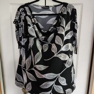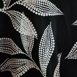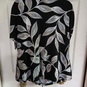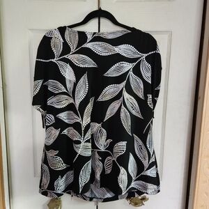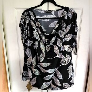 Elevate your wardrobe with this stylish black and white leaf print top. Perfect for any occasion, this top offers a chic and modern look.