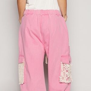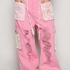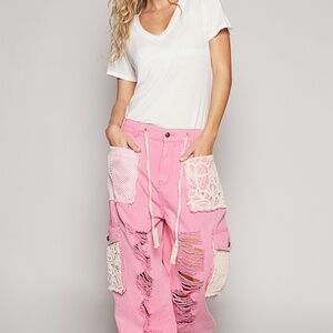 Crafted in 100% cotton twill, these pants feature heavy distress detailing, statement crochet patches, and a comfortable back elastic waistband with loop detail.