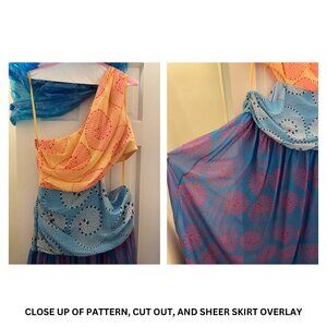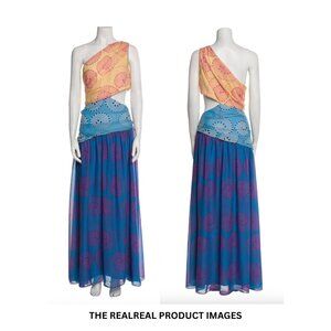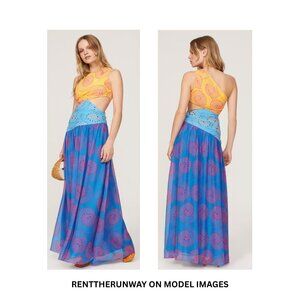 The Ashlyn maxi dress from Staud is a whimsical design that boasts a flattering one-shoulder silhouette and a mid-riff baring cutout. Made from chiffon in three hues, the swirled and dotted print adds dimension and movement.