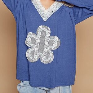 Pol Clothing Blue Lace Flower Patch Relaxed Fit Long Sleeve V Neck Top Size S-L