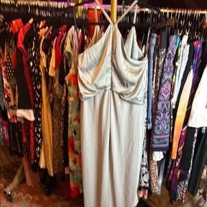 The TFNC Silver Sheath Halter Maxi Dress is a stunning choice for cocktail events and nights out. This elegant dress features a plunging halter neckline and a ruched tie front, creating a sophisticated silhouette. Its sleeveless design in a soft silver hue adds a touch of glamour, making it perfect for any formal occasion.