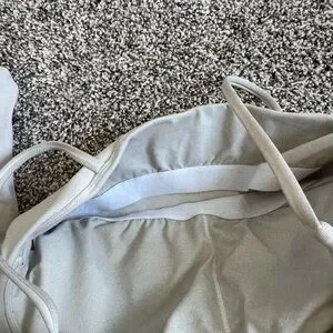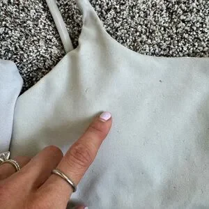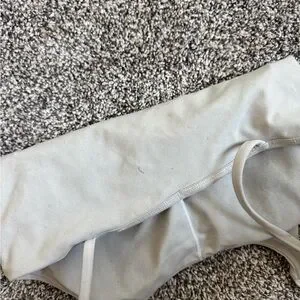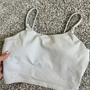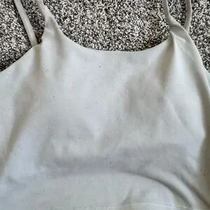 This cream camisole features a fitted design with thin spaghetti straps, offering a minimalist and chic look. The crop style makes it a versatile piece, perfect for layering or wearing on its own. Made from a stretchy material, it ensures comfort and ease of movement. Minor wear and spots. Removable padding