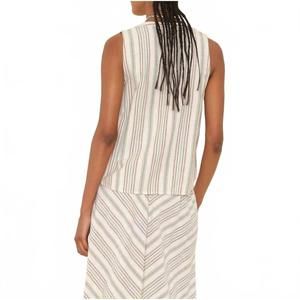 Embrace the boho chic trend with the Twyla Top by XIRENA, an effortless choice for your next beach day. This sleeveless tank top is crafted from 100% cotton in midweight striped fabric, featuring a band collar and partial rouleau button closure. Designed in Los Angeles, its lattice trim details add a touch of elegance, while the ivory sand color lends a fresh spring vibe. Care instructions include machine wash cold, gentle cycle, and line dry. The model is 5'10" and wearing a size small.