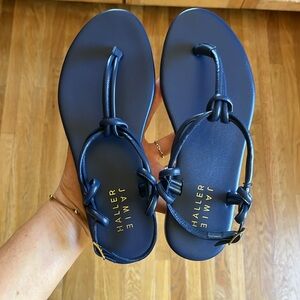 Bare and minimal, with beautiful little pretzel knots tied to hold it all together. Italian calfskin and soft skinny straps create this perfect, beauty forward, T strap sandal in a most beautiful navy blue color. Handmade in Italy.