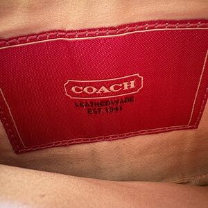 This authentic vintage Coach wristlet features canvas monogram, leather trim, and a silver tag. The color is a metallic black/gray. Zipper closure. Fits most phones or use it as a coin purse, wallet, make pouch!