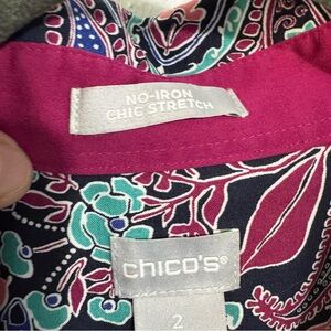 Embrace a vibrant look with Chico's button down shirt, showcasing a notched collar and a lively pink and blue color palette. The intricate paisley and floral patterns add a touch of retro flair, making it a standout piece for any occasion.