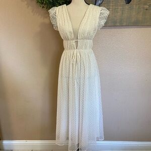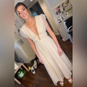 Elegant cream midi dress with polka dot design. Features a deep V-neck and sheer sleeves. Perfect for special occasions.