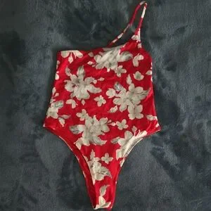NWOT. Stylish red one-shoulder swimsuit with white floral pattern. Perfect for a chic beach look.