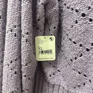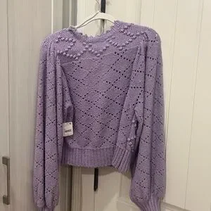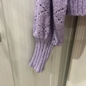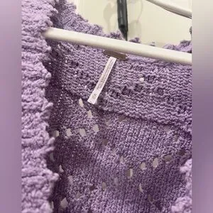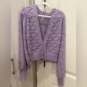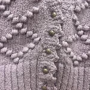 Chic lilac cardigan with textured knit. Features button-up front. Perfect for layering.