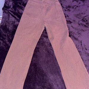 Chic brown jeans with butterfly and star prints. Distressed details for a trendy look. Flare and wide leg design.