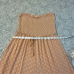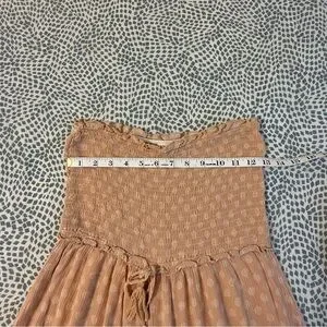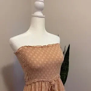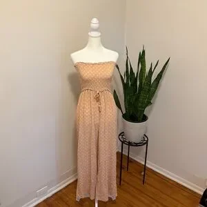 This strapless tan and white jumpsuit made of 100% rayon and is lightweight and flowy. The smocked top will fit 13” - 17”. Perfect for date night at the beach! 🏖️