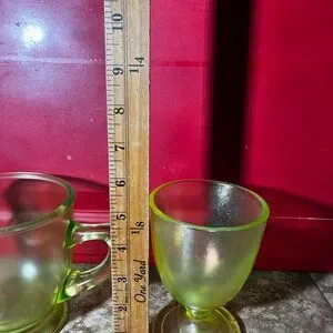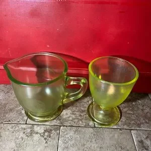 This pitcher we believe is a westmoreland orange and lemon or lime pitcher the cup is not branded but awesome. This is for both. Please see all pics for condition Thanks again