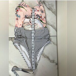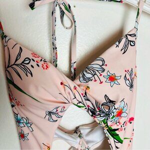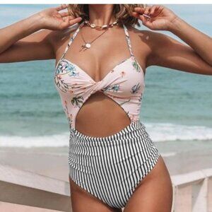 NWOT Cupshe Pink Floral Twist Front Striped Halter One Piece Cutout Swimsuit, M