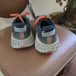 Used Hoka trail or hybrid road running shoes with vibram soles. Color is like a orange coral and blue. I took out the original insoles because I used my own when I used these so I suggest having your own insoles. I use Dr. Scholls for knee pain or Spenco work insoles. Imperfections shown in pictures. Absolutely loved these shoes, but time to rotate for something new.