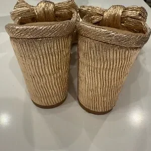 Step into elegance with Lulu's god metallic heels that feature a pleated fabric construction with a chic knotted bow at the vamp. Slide-on design and sturdy 3.5” block heel make these the perfect plus one to your look. Never worn.