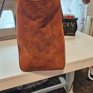 This is a large/shopper bag, and it can hold a lot. It is leather and suede in a rust coloring - Great for fall. It is gently used (by me for one fall) like new condition. The straps can be shortened or lengthen to fit your needs. Made in Indonesia.