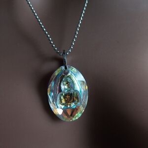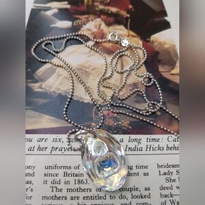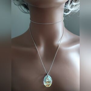 This elegant silver necklace features a stunning iridescent pendant, perfect for adding a touch of sophistication to any outfit. The shimmering colors of the pendant catch the light beautifully, making it a standout piece in your jewelry collection.