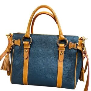 Experience the timeless elegance of the Dooney & Bourke satchel, crafted in a striking blue with tan leather accents. This sophisticated bag combines style and practicality, featuring gold-tone hardware for a touch of luxury. Perfect for any occasion, it embodies the brand's signature design and quality craftsmanship.