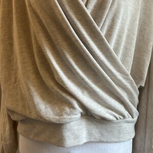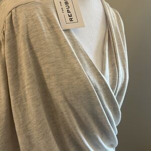 NWT. This For The Republic gray wrap blouse, features a relaxed fit and long sleeves. The crossover design and drop sleeves create a flattering silhouette, while the incredibly soft jersey knit fabric ensures comfort and style. Wide ribbed band at waist and at wrists. Perfect for any occasion, this top is a versatile addition to your wardrobe. Easy care machine wash.