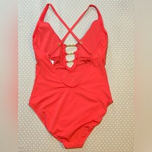 Bleu Rod Beattie fire engine red lace down plunge one piece swimsuit with gold colored bamboo look ladder style lace down embellishments at v-plunge - light removable padding (remove it or add more) Adjustable straps - Brand new with tags - Size 12