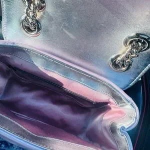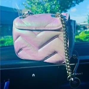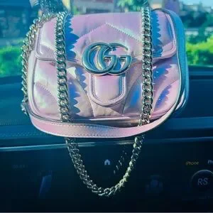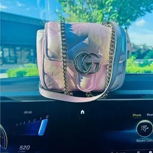 Experience the elegance of Gucci with this stunning pink iridescent Marmont quilted crossbody bag, designed to make a statement. The bag features a chic chain strap and a structured silhouette, perfect for adding a touch of sophistication to any outfit. Its vibrant pink hue ensures you stand out, whether you're heading to a casual outing or a special event. It has a small scuff on front