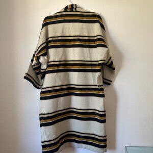 Very cute and cozy The Odells striped duster coat in Cream, Tan, Mustard and Black oversized stripes originally purchased at Anthropologie. Size small but would say it's an oversized small. No closure, open front. Drop shoulder, kimono sleeves. The material is peeling a bit.