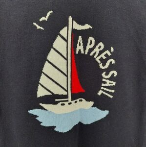 Stay stylish and cozy. This navy open sweater features a chic sailboat design, perfect for a nautical look.
