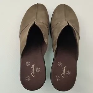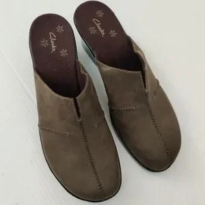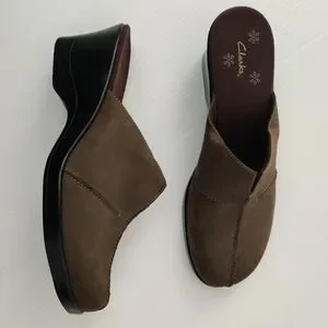 Suede mules by Clarks. Easy slip-on design. Nubuck Suede Leather with just the right amount of height. Padded insoles, soft lining. Lightly used, clean condition. Heel: 2.5". Dark green with brown insoles.