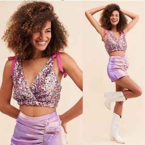Free People Sz. S Pink Big Night Sequin Crop Top Party Cocktail Barbie Glam