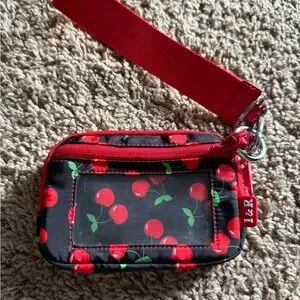 Stylish wristlet featuring a cherry print design. Includes a convenient ID window. Perfect for on-the-go use.