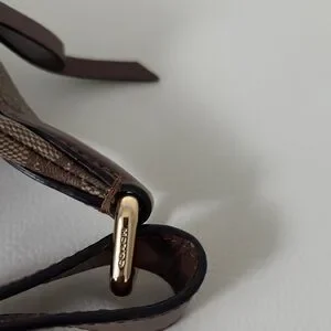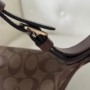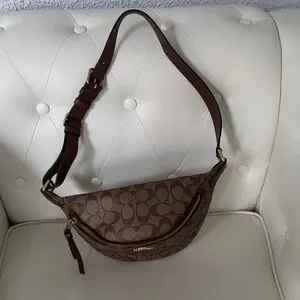 Elegant Coach crossbody with iconic monogram. Features adjustable strap and gold accents.