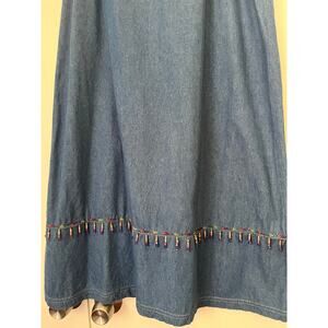 This boho-chic ensemble features a denim A-line skirt and a matching button down blouse, both adorned with unique beading details and embroidery.