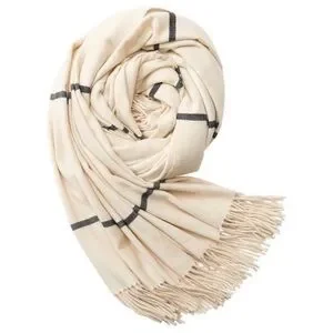 This Indigo scarf in cream and black features a soft, lightweight texture with elegant black stripes and delicate tasseled fringe, making it a versatile accessory for any outfit.