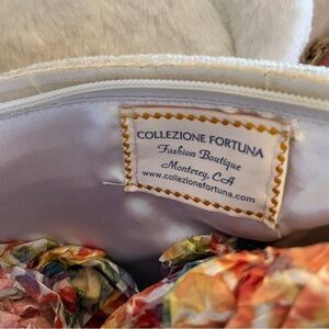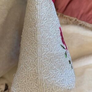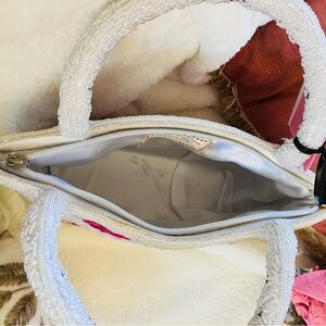Elegant handbag featuring vibrant pink floral embroidery on a white background. Perfect for adding a touch of sophistication to any outfit. Beautiful white iridescent barrel beads front and back of handbag with embroidery done by hand in a two- tone light and dark fuchsia accented by light and dark green leaves . Same design is also on the 2 handles. Full zipper closure. Lining color is a very light silver.
