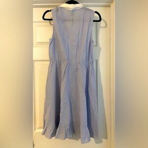 Elegant striped blue midi dress with a stylish tie-front design. Perfect for any occasion.
