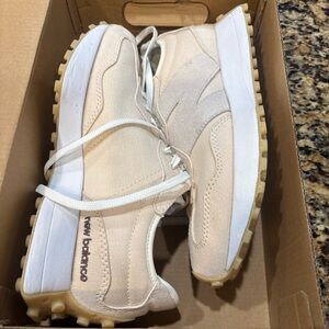 Stylish New Balance sneakers in beige and white. Perfect for casual outings. Comfortable and trendy design.