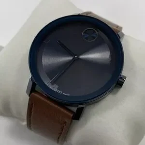 A monochromatic design gives this men's Movado BOLD Evolution watch both edge and style. The watch features a thin 40mm blue ion-plated stainless steel case, K1 crystal, and blue sunray dial with matching sunray dot/hands. The brown leather strap secures in place with a buckle clasp.