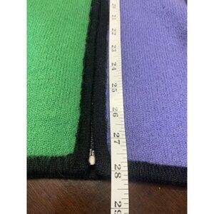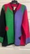 This Coldwater Creek cardigan features a vibrant patchwork design with a professional and creative aesthetic. Crafted from 100% wool, it offers warmth and style.
