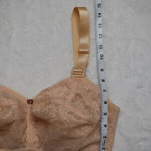 Pre-owned, great condition. No visible holes or stains. Minimal signs of wear. Neutral nude floral lace and mesh. Adjustable straps. Helps correct posture by pulling shoulders back. Helps relieve upper back and shoulder pain, and alleviate premenstrual tenderness. Enlarges size of breasts by lifting and eliminating fragmented appearance. No padding, underwire, or boning. Hook and eye closure - 4 positions. Size per tag: 30J. Fabric: 62% Polyamide/ 33% Cotton/ 5% Elastane. Made in Mexico. Size per tag does not guarantee desired fit, please see pictures for measurements. Please note that length pictures were taken with the straps extended to the max.