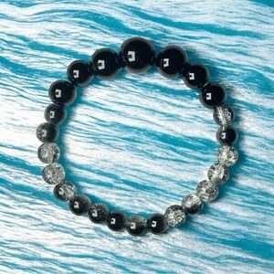 This elegant bracelet features a stunning combination of semi-precious natural stone onyx and black & clear crackle glass beads, perfect for adding a touch of sophistication to any outfit. Ideal for both casual and formal occasions.
