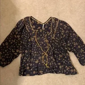 This relaxed blouse from Free People showcases a chic gold and gray color scheme, highlighted by its boxy silhouette , 3/4 sleeves, and tie front. The embellished design adds a touch of sophistication, perfect for elevating any outfit.