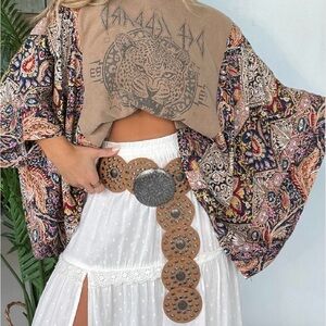 Stylish bohemian top featuring Def Leppard graphic. Includes a colorful paisley kimono. Perfect for a unique look worn cropped or loose.