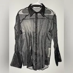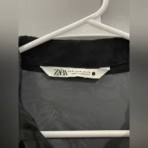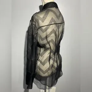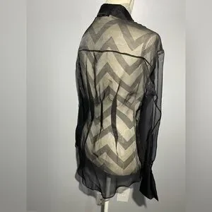 This elegant top from Zara features a sheer design with a sophisticated black and gray chevron pattern. The button-down style is complemented by a classic dress shirt collar, making it a versatile addition to any wardrobe.