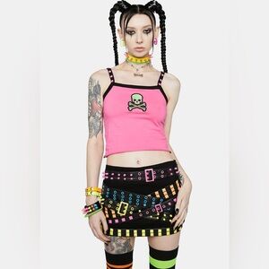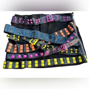 oops, causing trouble again! You're sorry not sorry in this ponte knit mini skirt with a multi belted design, neon studded and spiked hardware, and a side zip closure.