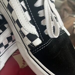 Iconic Vans with black and white checkered design. Timeless style for everyday wear.