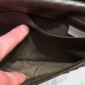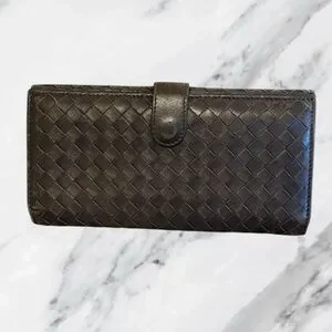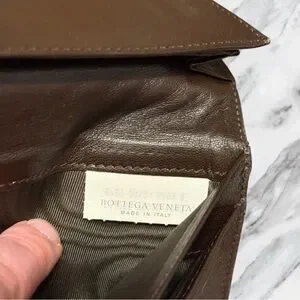 This authentic Bottega Veneta continental wallet features the brand’s signature dark brown intrecciato woven leather and a secure flap snap closure. The exterior leather shows a little fading, visible wear along the edges, including rubbing on the corners and minor creasing on the flap from use. The back side has a few faint surface scratches consistent with handling. Inside, the wallet offers ample organization with ten card slots, two long bill compartments, and two open interior slip sections. The leather interior is clean but has visible creasing and light wear from regular use. There is some interior warping near the top fold and faint finish loss along the seams. The fabric-lined compartment shows minor wear but remains intact and functional. Stamped “Bottega Veneta Made in Italy” inside with a matching fabric tag sewn into the lining. A timeless, elegant piece in usable vintage condition.