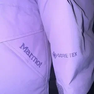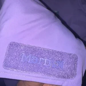Vibrant Marmot jacket in purple with striking yellow details. Ideal for outdoor adventures.