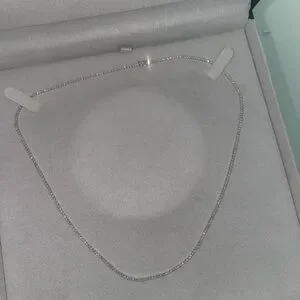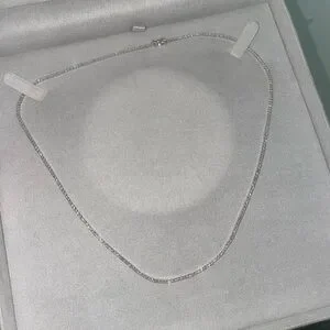 This delicate tennis necklace features a minimalist design with a thin, dainty chain that gracefully rests at collarbone length. Its subtle elegance makes it a perfect everyday accessory, adding a touch of sophistication to any ensemble.